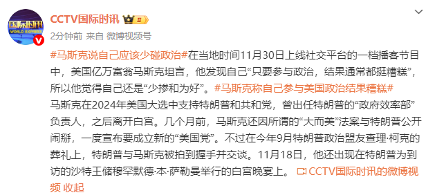 据@CCTV国际时讯 消息:当地时间11月30日上线社交平台的一档播客节目中启盈优配,美国亿万富翁马斯克坦言,他发现自己“只要参与政治,结果通常都挺糟糕”,所以他觉得自己还是“少掺和为好”。