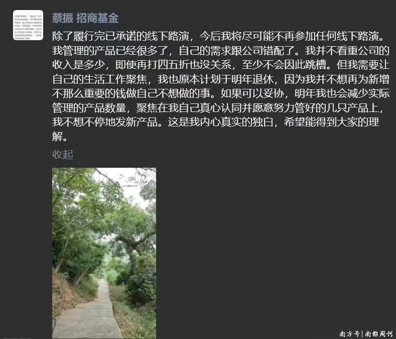 网传截图显示,蔡振的核心诉求聚焦“减少管理产品数量”与“聚焦精力”。他在朋友圈明确提到,除履行完已承诺的线下路演外,今后将尽可能不再参与任何线下路演;自己并不看重公司收入高低,核心诉求是摆脱超负荷管理状态,在退休前专注做好少数产品。