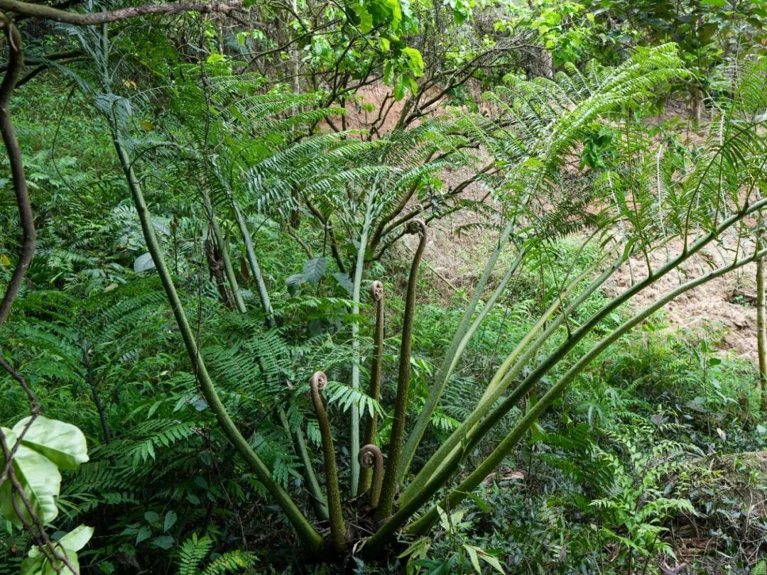 2023年初,一次日常开展的工作巡查,梁俊杰与同事在保护区内发现了一群形态特殊的“巨型”观音座莲。它们外形与常见的“福建观音座莲”相似,但植株更为高大魁梧,部分个体高度可达5米,且叶柄更为粗壮,密被鳞片。这些细微的差异引起了大家的警觉。